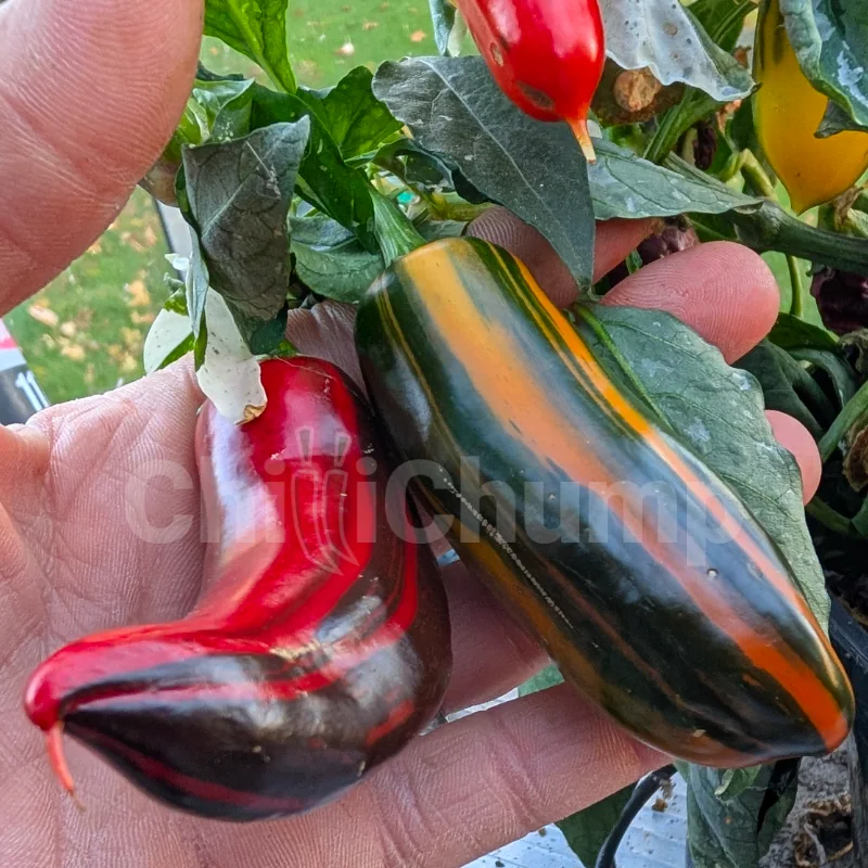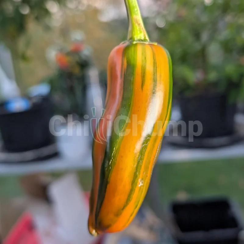 The Candy Cane Thin is a refined form of the Candy Cane chilli, selected for slimmer pods and stronger striping. This Capsicum annuum produces long, narrow fruit with sharp white bands over green skin, ripening through to red as the markings fade. Heat is mild, around jalapeño level, with a clean, green flavour that works well fresh. The thinner walls make it especially good for quick pickling, slicing and drying. Plants are vigorous and ornamental, cropping well over a long season.