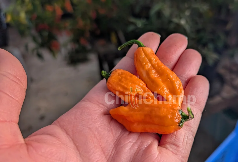 The MA Warthog Orange is a superhot Capsicum chinense bred by Matthew Arthur from a Wartryx Ă— 7 Pot Primo cross. This is an unstable variety, so you can expect variation in pod shape, size, and colour.