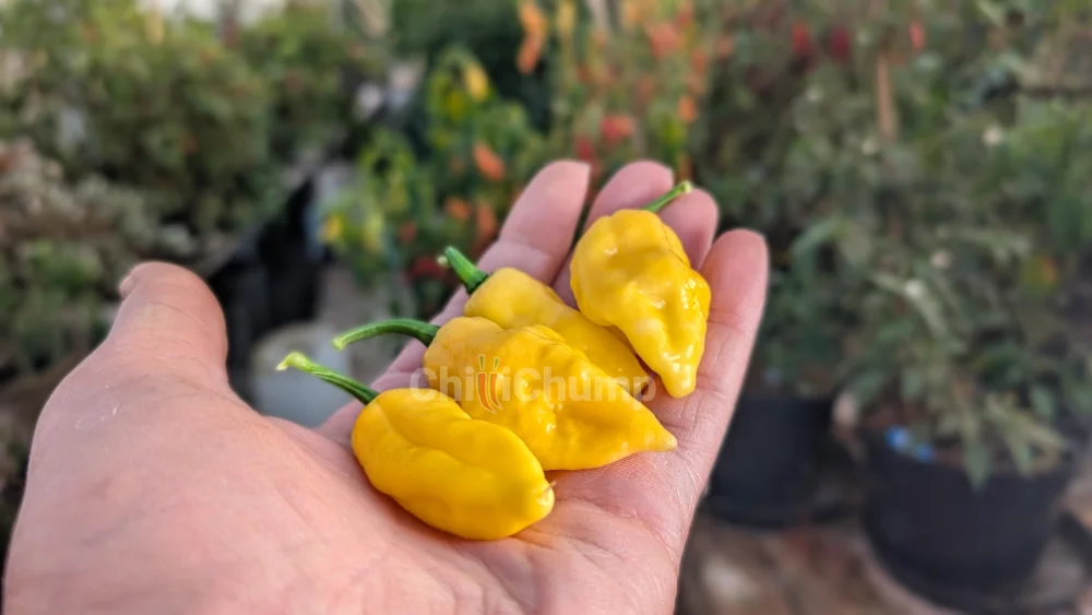 The MA Warthog Yellow is a superhot Capsicum chinense bred by Matthew Arthur from a Wartryx Ă— 7 Pot Primo cross. This is an unstable variety, so you can expect variation in pod shape, size, and colour. The seeds offered here are from the same plant that I tried a pod from on my livestream (see below). Definitely not as hot as the red one, but still VERY hot.