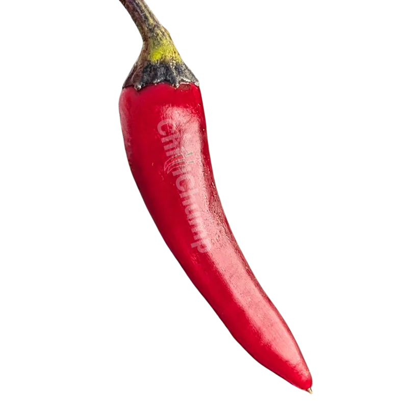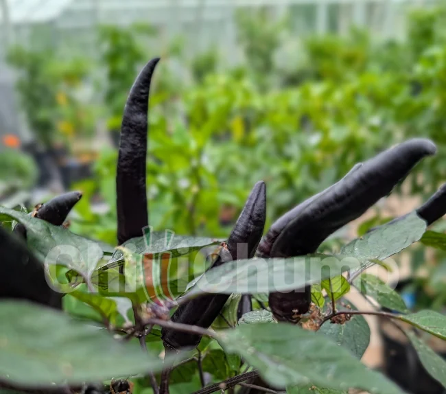 The Vampire chilli is a striking Capsicum annuum with dark foliage and glossy pods that start black before ripening to deep red. Heat ranges between 15,000 and 30,000 SHU, offering a medium burn and bold, clean flavour. The sleek, fang-shaped pods hang neatly against the dark leaves, giving a dramatic contrast as they mature. Plants grow vigorous and bushy, producing a strong crop through summer. I find it both ornamental and productive, well suited to large pots or open ground.